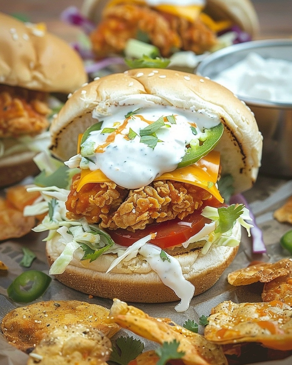 A crunchy, juicy chicken sandwich layered with a tangy, creamy slaw and a hint of heat. This homestyle favorite brings together crispy fried chicken, soft toasted buns, and a refreshing cabbage topping for a satisfying bite every time.