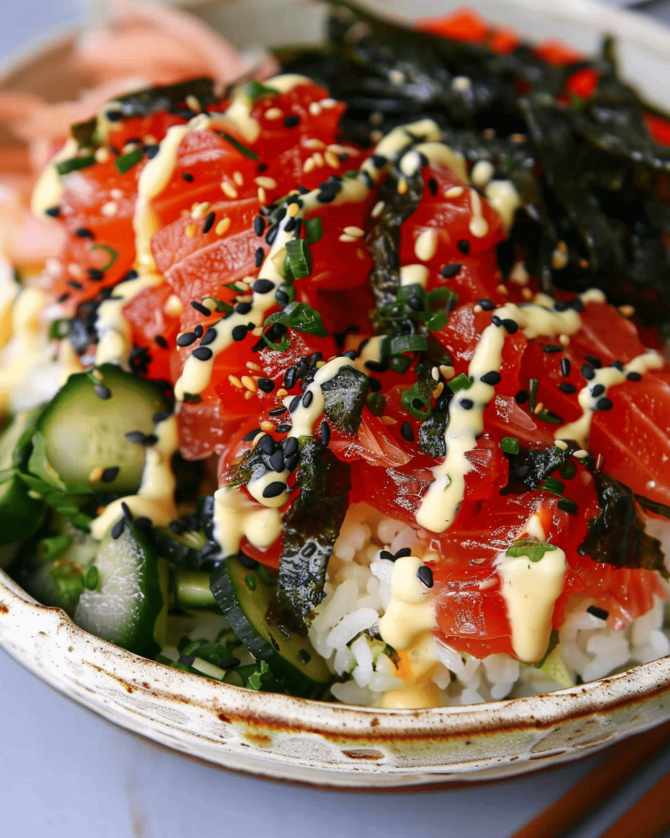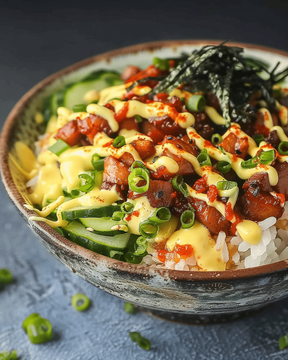 A comforting Japanese-inspired rice bowl made with warm short-grain rice, tender canned tuna, crisp cucumbers, creamy Japanese mayo, spicy sriracha, and savory roasted seaweed. It comes together in just minutes, making it ideal for quick lunches or weeknight dinners.