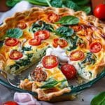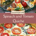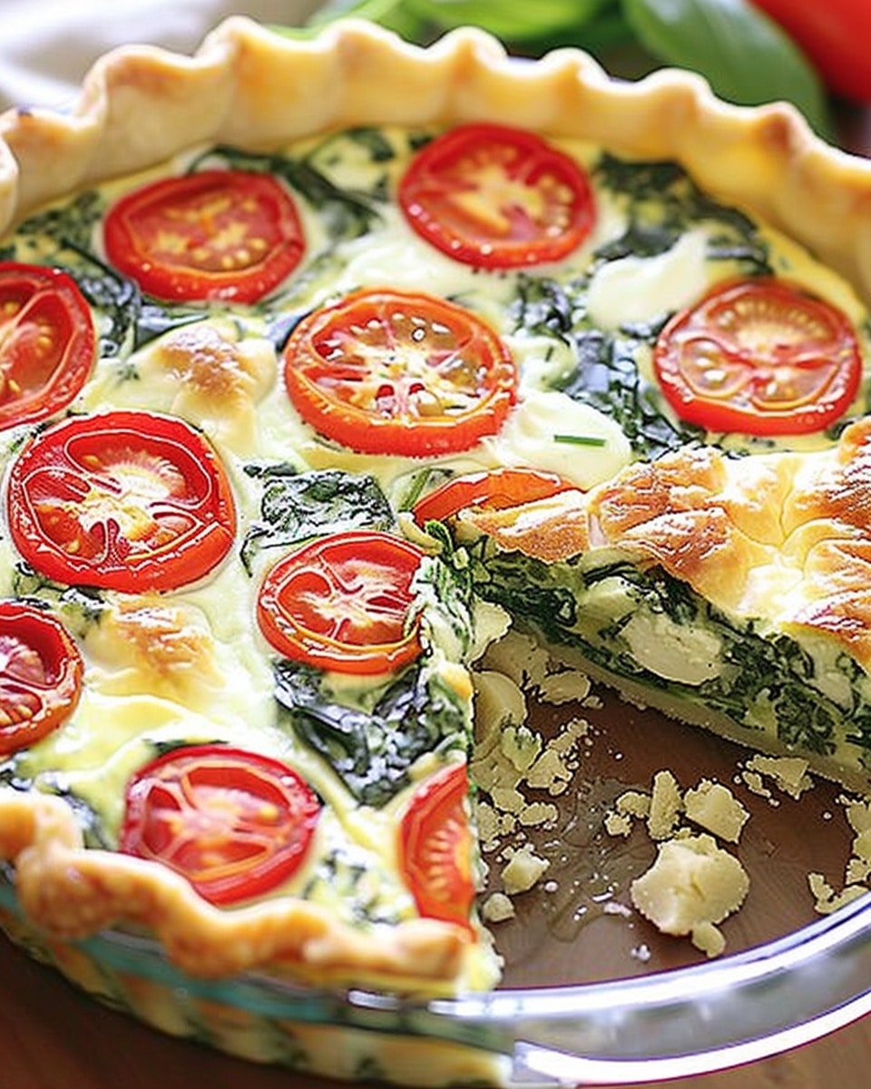 A savory and creamy Spinach and Tomato Quiche featuring tender spinach, juicy cherry tomatoes, and rich cheese baked inside a flaky crust. Perfect for breakfast, brunch, or a light dinner.