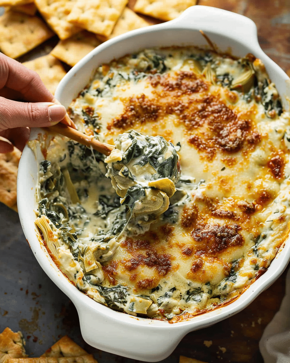 This warm, creamy spinach artichoke dip is packed with cheese, spinach, and tender artichokes for the ultimate crowd-pleasing appetizer. It bakes up bubbly in just 20 minutes and is perfect for parties, potlucks, or game day.