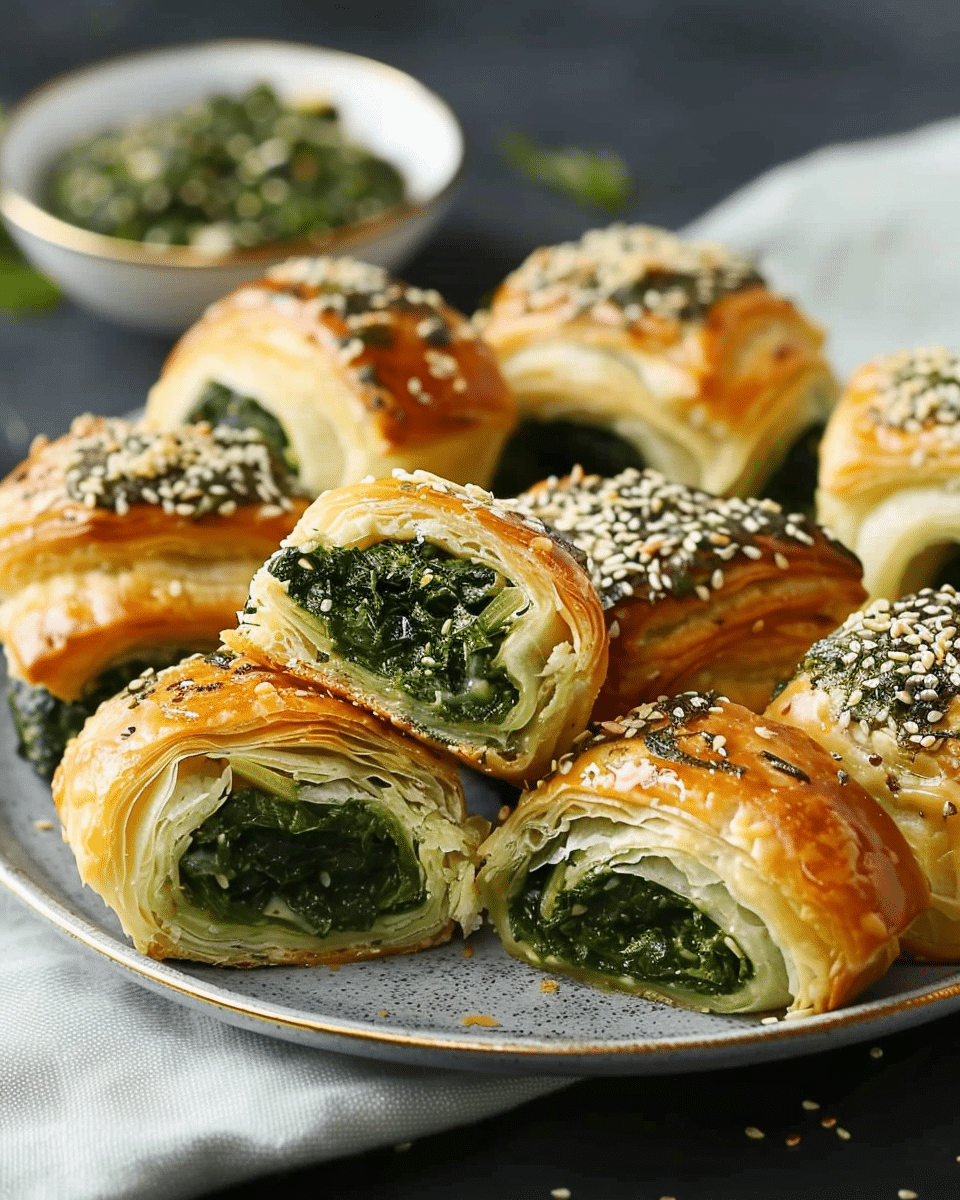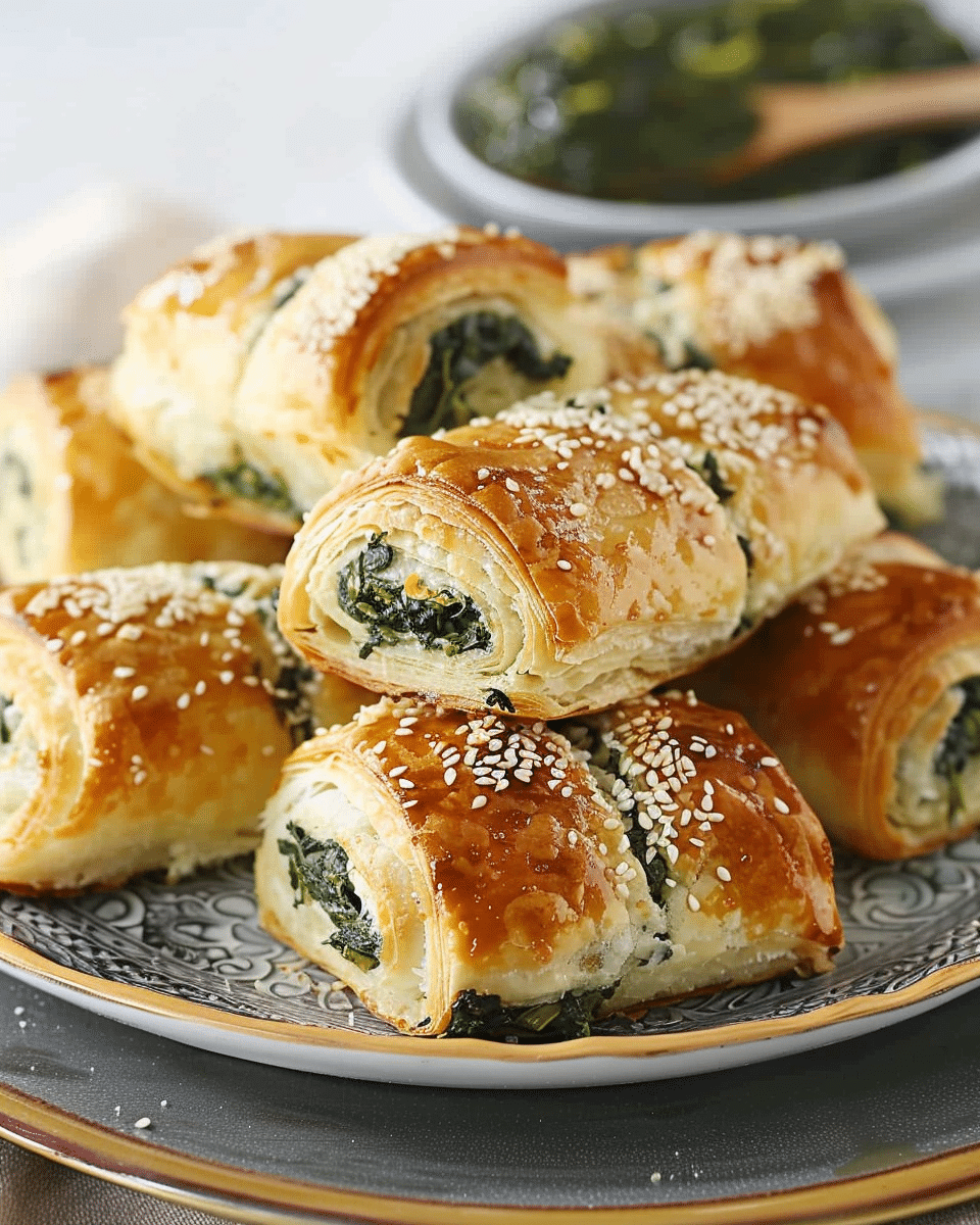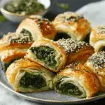 These spinach rolls wrapped in golden, flaky puff pastry are a delicious savory snack or appetizer. Packed with sautéed garlic, chopped spinach, and salty feta cheese, they strike the perfect balance between crisp, buttery texture and creamy, flavorful filling. Easy to prepare and crowd-pleasing, they make an excellent finger food for parties, picnics, or as a light lunch when paired with salad or soup.