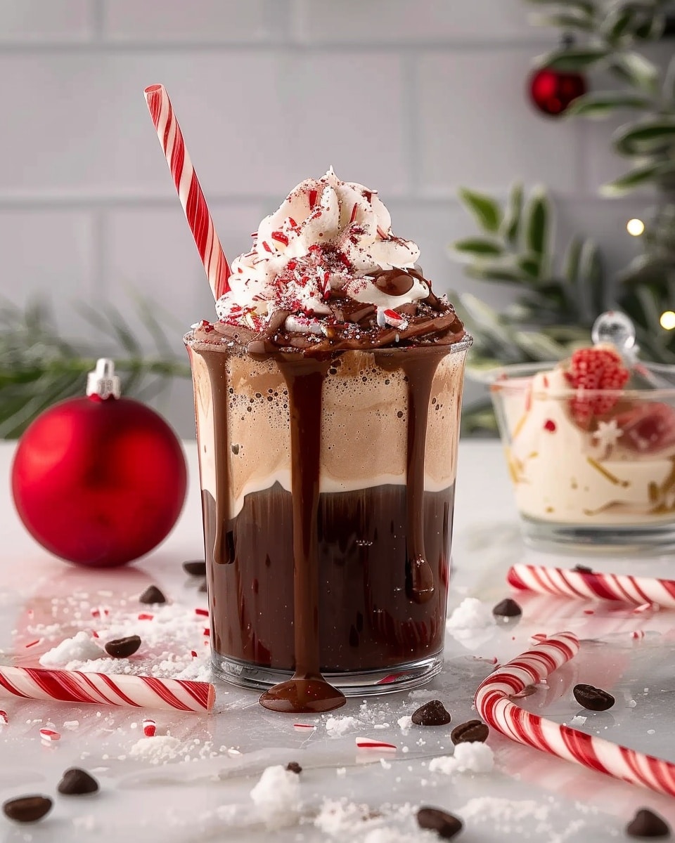 Slowly pour the peppermint chocolate cream over the cold coffee. It should float gently on top, creating a layered effect. For a finishing touch, drizzle extra chocolate syrup over the cream and sprinkle crushed peppermint candies if desired.