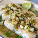 Pour the lime-garlic-chili sauce over the fish, ensuring most of the garlic and chilies rest on top.