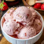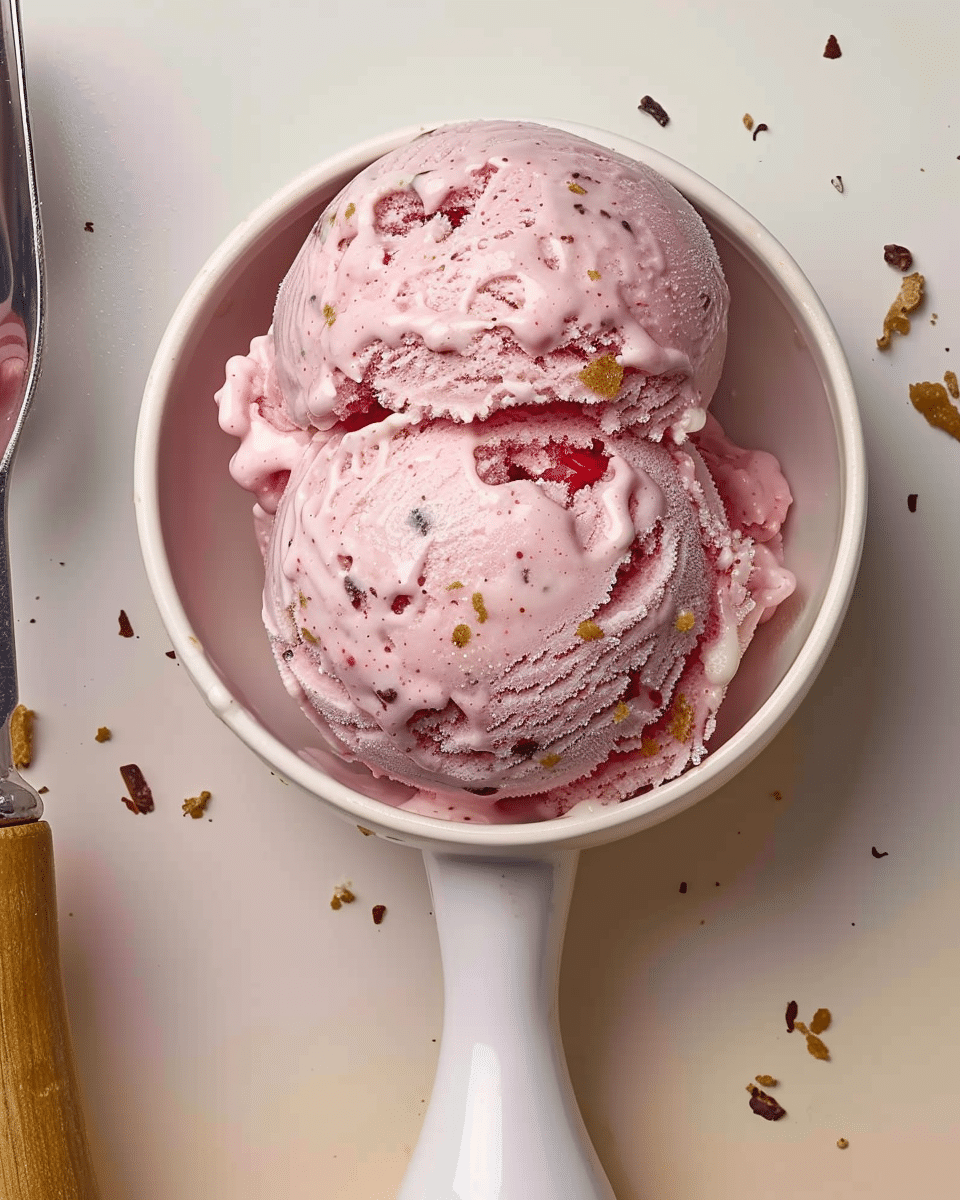 This creamy and fruity strawberry-cheesecake ice cream delivers the classic dessert flavor in frozen form, featuring cream cheese, strawberries, and graham cracker crunch — no ice cream maker required.
