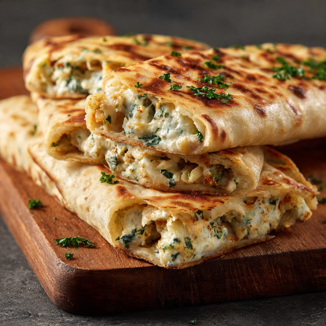 Warm, soft flatbread filled with melted cheese and your favorite savory fillings, then finished with fragrant garlic butter. This is the kind of comforting, flexible recipe that works just as well for a quick dinner as it does for using up leftovers in the fridge.