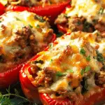 This hearty and colorful stuffed peppers recipe combines tender bell peppers with a savory mixture of ground beef, rice, spinach, and warm seasonings. It’s a comforting, wholesome dish that works beautifully for weeknight dinners, meal prep, or make-ahead meals for busy days.