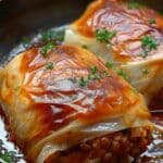 Store leftover cabbage rolls in an airtight container in the refrigerator for up to 4 days. To reheat, place them in a covered dish in the oven at 180°C (350°F) for about 15–20 minutes, or microwave individual portions for 2–3 minutes. These rolls also freeze well; store in freezer-safe containers for up to 2 months and thaw overnight before reheating.