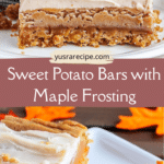 Soft and warmly spiced sweet potato dessert bars made with mashed sweet potatoes and ground walnuts for a moist texture, topped with fluffy maple buttercream frosting for a cozy fall-inspired treat.