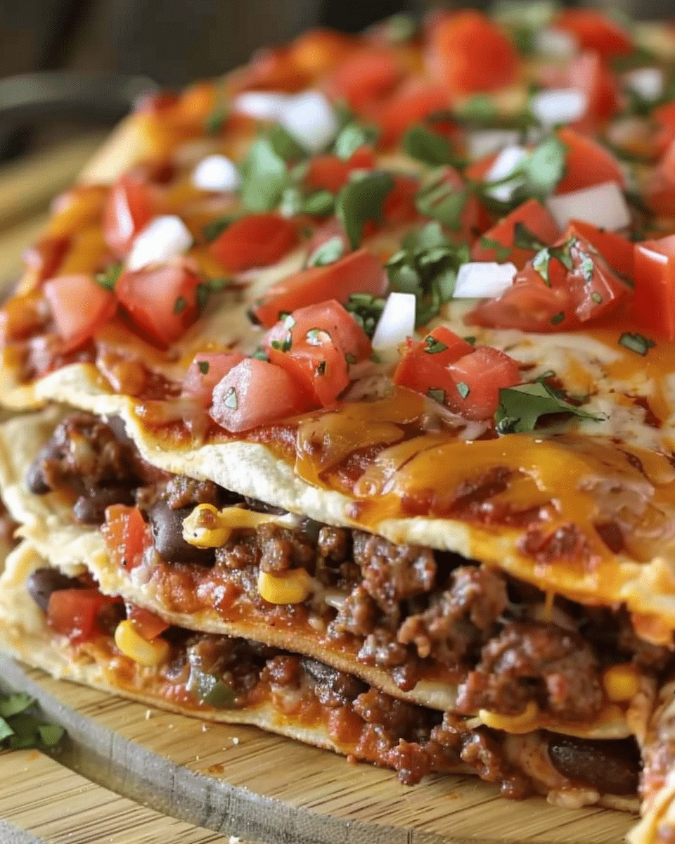 A homemade version of Taco Bell’s Mexican Pizza featuring crispy tortillas layered with seasoned beef, refried beans, enchilada sauce, melted cheese, and fresh toppings. Easy to make and packed with bold, nostalgic flavors.