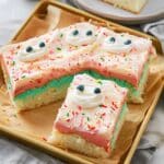 Once cooled, spoon the different colored frostings over the cake and swirl them together to create your monster design. Add candy eyeballs if using. Slice and serve.
