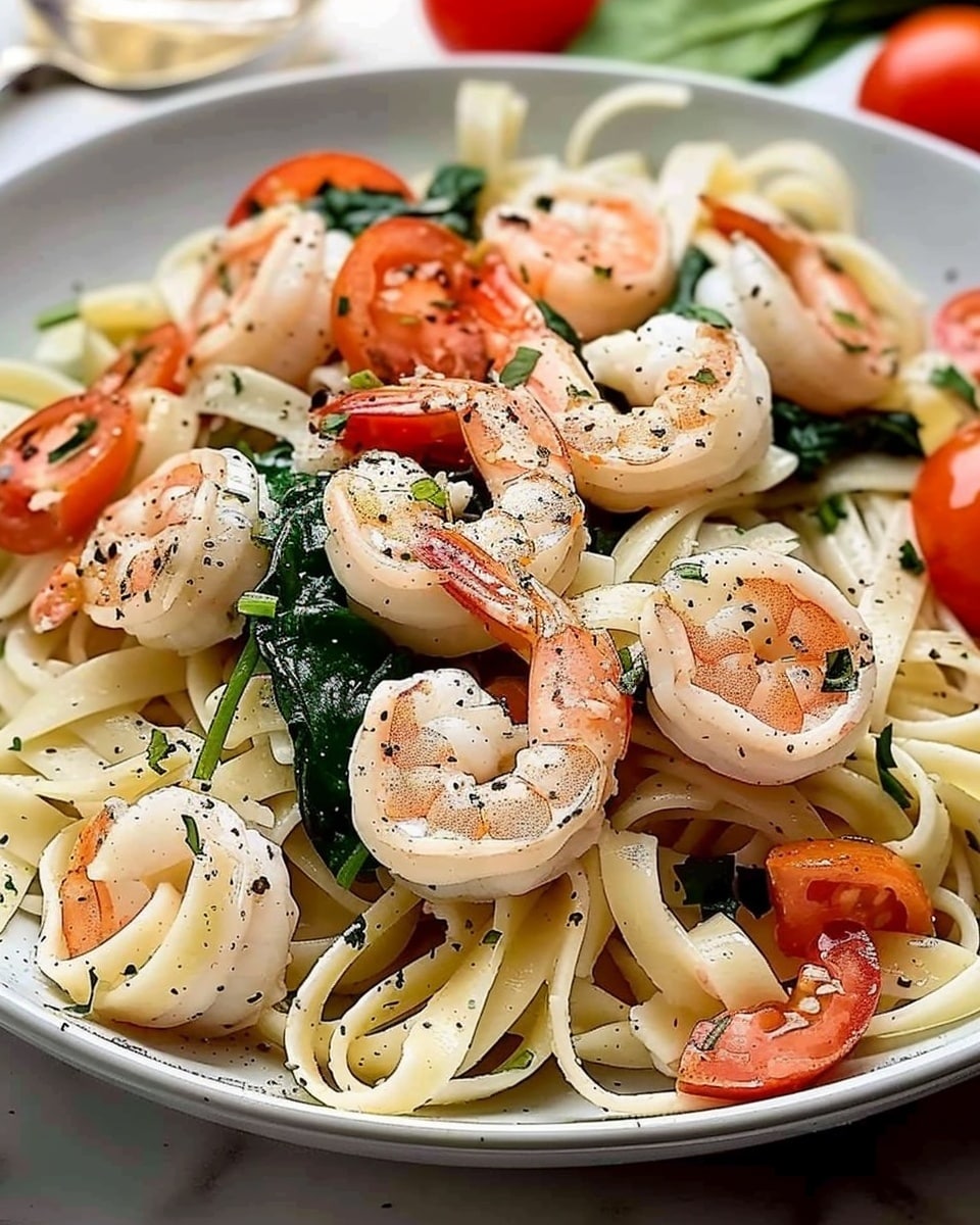 A comforting and flavorful pasta dish that combines juicy shrimp, tender spinach, and a rich tomato sauce. This recipe is perfect for a quick weeknight dinner yet elegant enough to serve for guests.