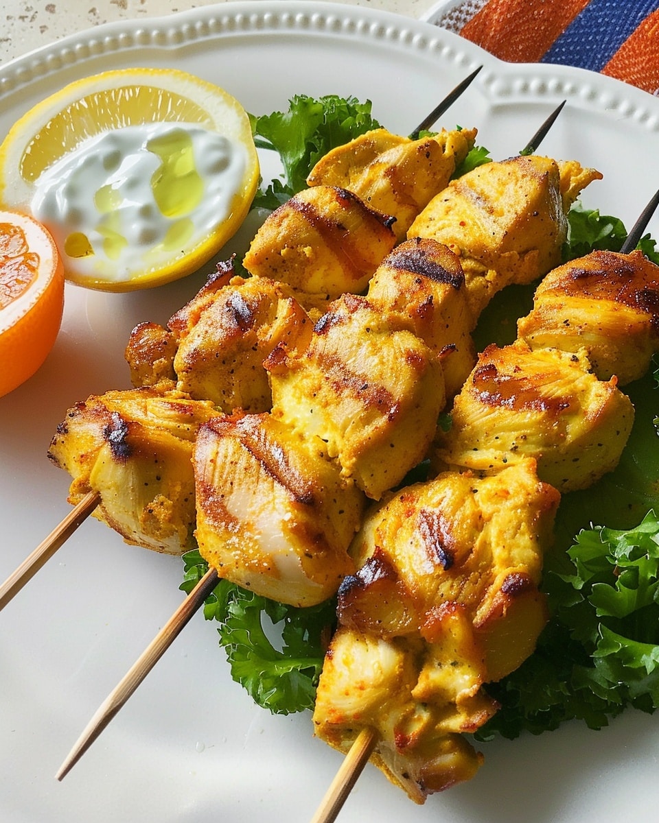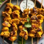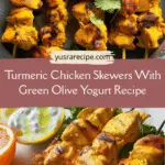 Bright and savory turmeric chicken skewers marinated in spiced yogurt, served with a tangy green olive yogurt sauce. A fresh, flavorful dish perfect for grilling or quick weeknight meals.