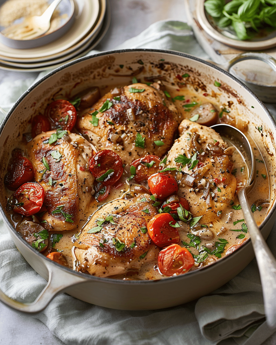 Tuscan chicken is a creamy, comforting dish made with tender chicken thighs simmered in a flavorful sauce of sun-blushed tomatoes, spinach, and Parmesan. It’s rich yet fresh, perfect for both weeknight dinners and special occasions.