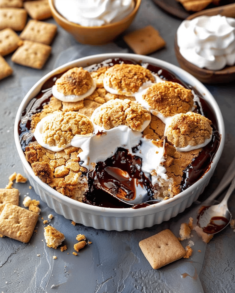 This dessert brings together the comfort of a cobbler and the timeless joy of classic s’mores. The buttery graham base adds crunch, the velvety chocolate layer melts beautifully, and the toasted marshmallows create that unmistakable s’mores flavor. It’s simple to make, visually impressive, and a guaranteed hit for all ages.