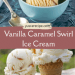 This vanilla caramel swirl ice cream combines a rich, creamy custard base with luscious ribbons of caramel for an indulgent homemade dessert. The perfect blend of buttery sweetness and classic vanilla flavor in every scoop.