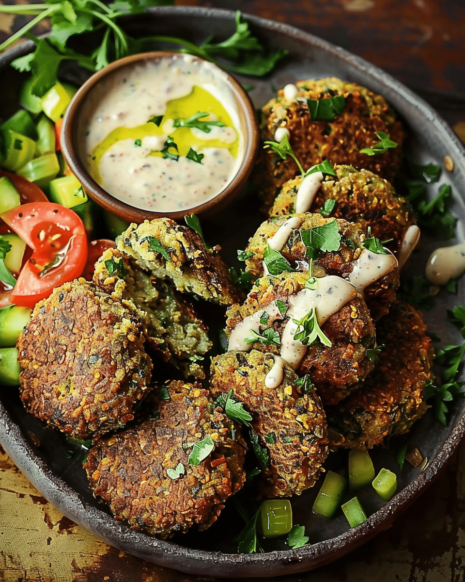 Vegan crispy baked falafel with tahini sauce is a hearty yet light dish featuring garbanzo beans, garlic, herbs, and spices baked to golden perfection. Served with a creamy lemon tahini sauce, it’s flavorful, plant-based, and versatile for wraps, salads, or snacking.