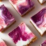 A vibrant and creamy no-bake dessert featuring a walnut-date chocolate crust topped with a silky cashew-based cheesecake layer swirled with dragon fruit and raspberry. Naturally vegan, gluten-free, and refined sugar-free, these bars are a refreshing, tropical-inspired treat straight from the freezer.