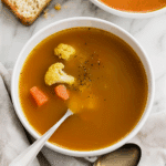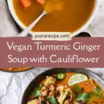 This Vegan Turmeric Ginger Soup with Cauliflower is a vibrant, nourishing blend of warming spices, hearty vegetables, and plant-based protein. Made with turmeric, ginger, garlic, and chickpeas, it’s a quick and comforting soup perfect for weeknights or meal prep.
