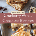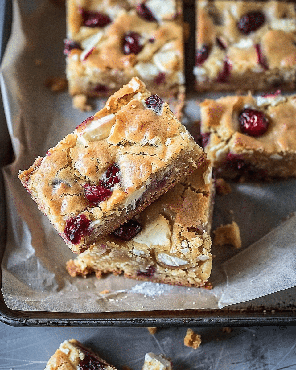 Chewy, buttery blondies studded with creamy white chocolate chunks, tart dried cranberries, and a hint of fresh orange zest. These bars bake up with crisp edges and a soft center, making them a perfect holiday or anytime treat.