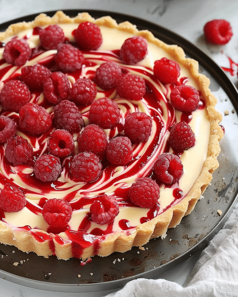 This White Chocolate Raspberry Tart is an elegant no-bake dessert with a crisp biscuit base, silky white chocolate ganache filling, swirls of tangy raspberry coulis, and fresh raspberry topping. It’s a show-stopping treat that’s effortless to make and perfect for entertaining.