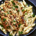 This creamy white sauce chicken pasta delivers a velvety garlic–parmesan sauce, tender strips of seared chicken, and perfectly cooked pasta—all ready in about 30 minutes. It’s comforting, simple, and ideal for weeknights.