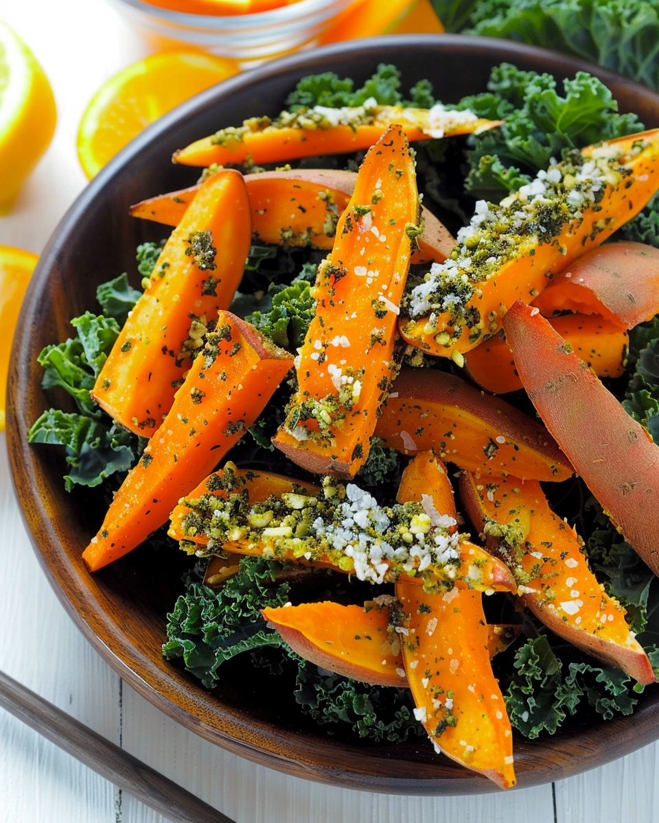 This recipe is simple yet full of personality. The sweet potatoes are lightly crisp on the outside and soft inside, while the kale is mellowed with citrus and garlic for a balanced bite. The za’atar seasoning adds a tangy, earthy depth that makes the whole dish taste exciting and memorable. It’s naturally plant-based, wholesome, and flexible enough to serve warm or cold.